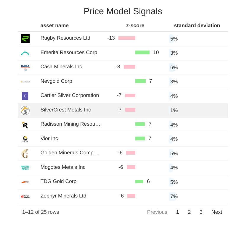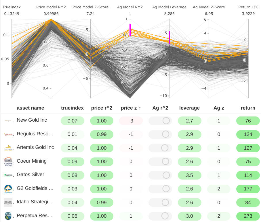 Mining stocks with high leverage see large price gains when metal prices rise. At SilverQuant, we use statistical models to measure leverage factors directly.Our special visual stock screener lets you compare these results across over 900 mining companies, making it easy to find companies of interest.